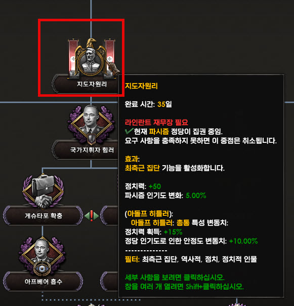 라인란트 재무장을 완료했다면, 바로 다음 국가 중점으로 지도자 원리(Führerprinzip)를 선택하는 것이 좋습니다.